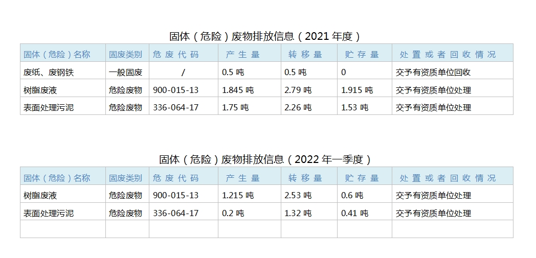 鑫雙利(惠州)樹脂有限公司2022年第一季度固體廢物信息公開表